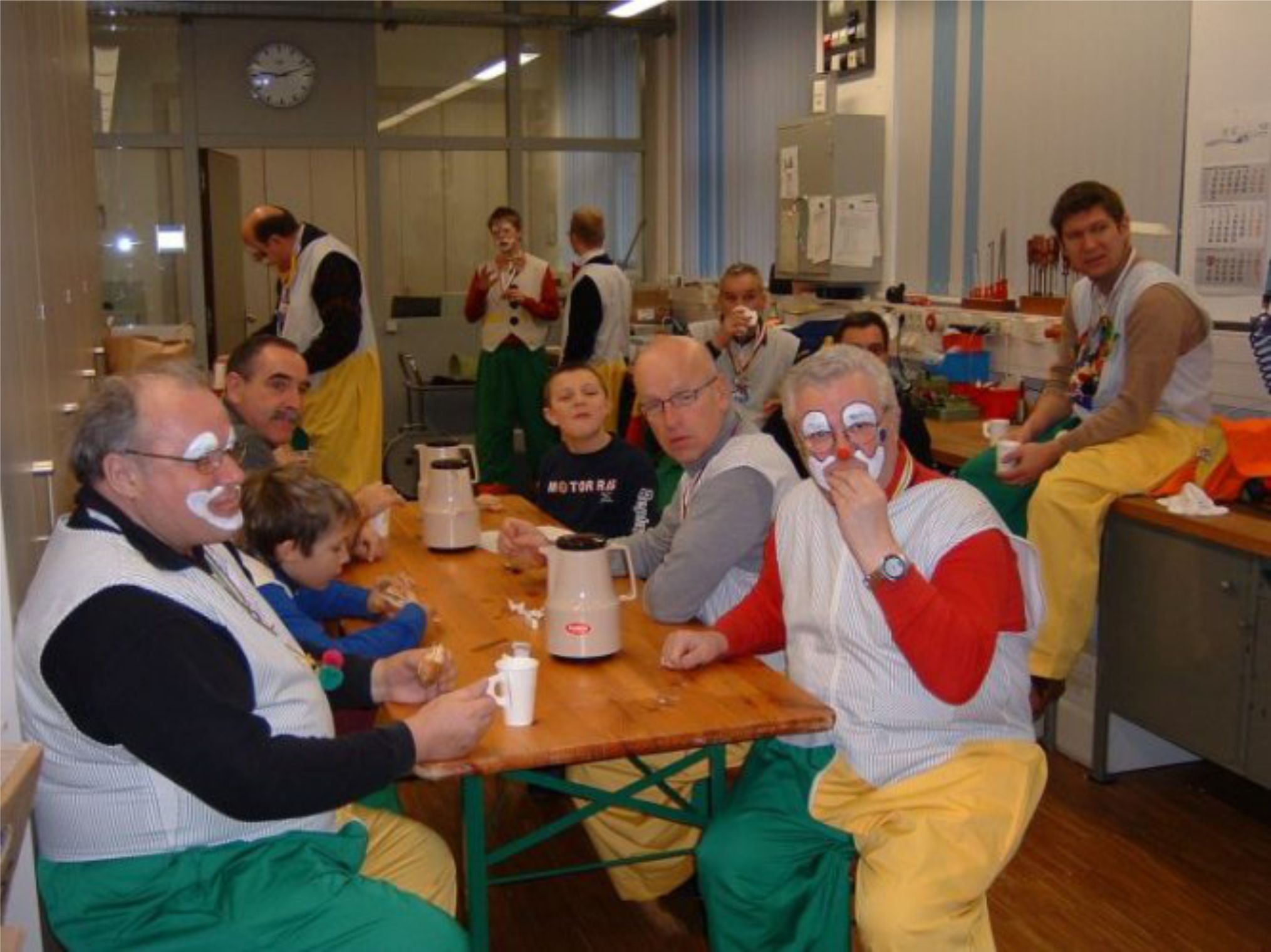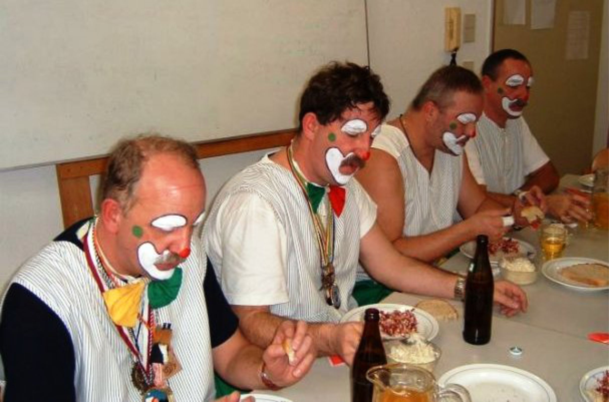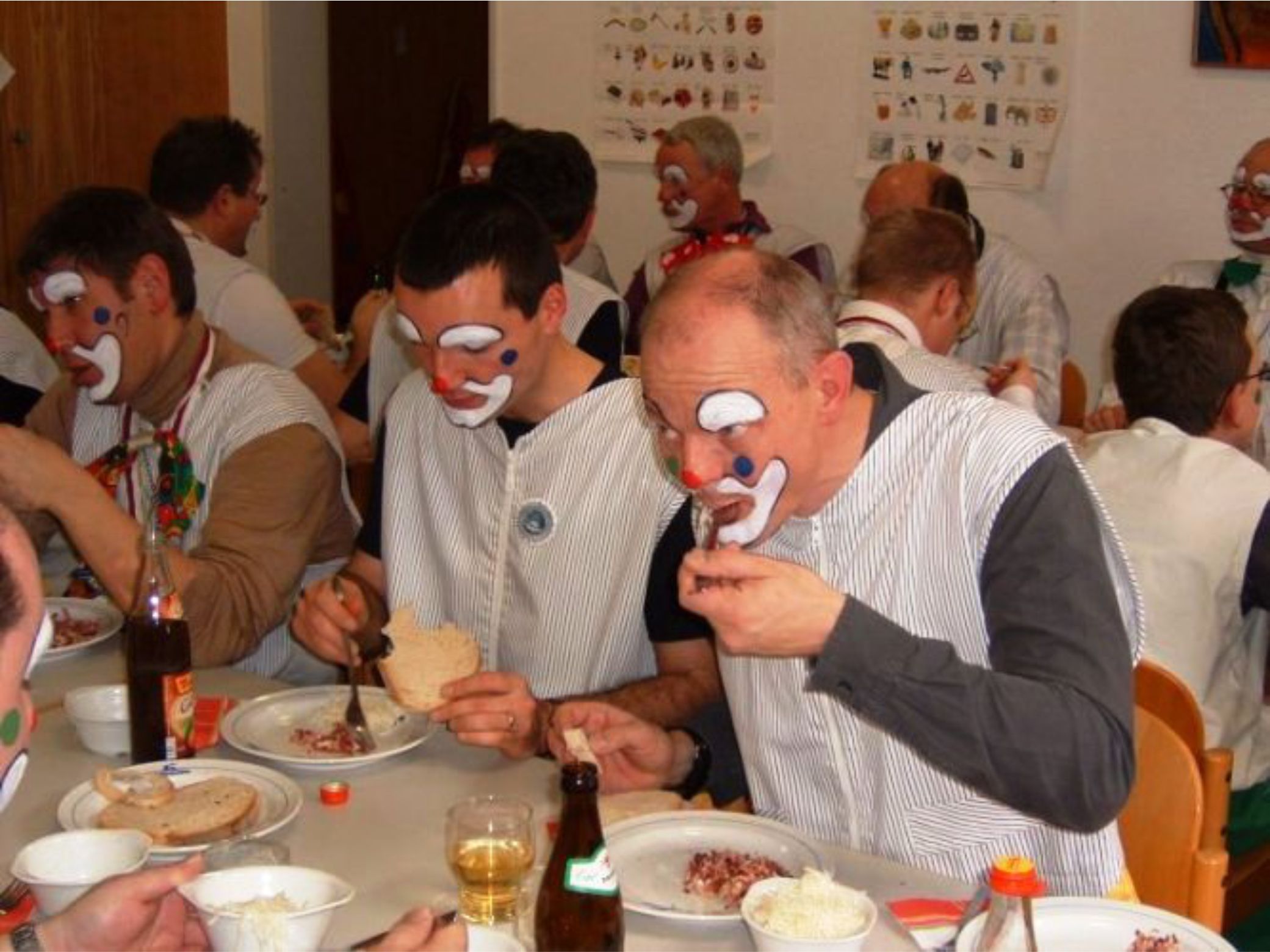 Rosenmontag: Gemeinsames Frühstücken der Clowngruppe.