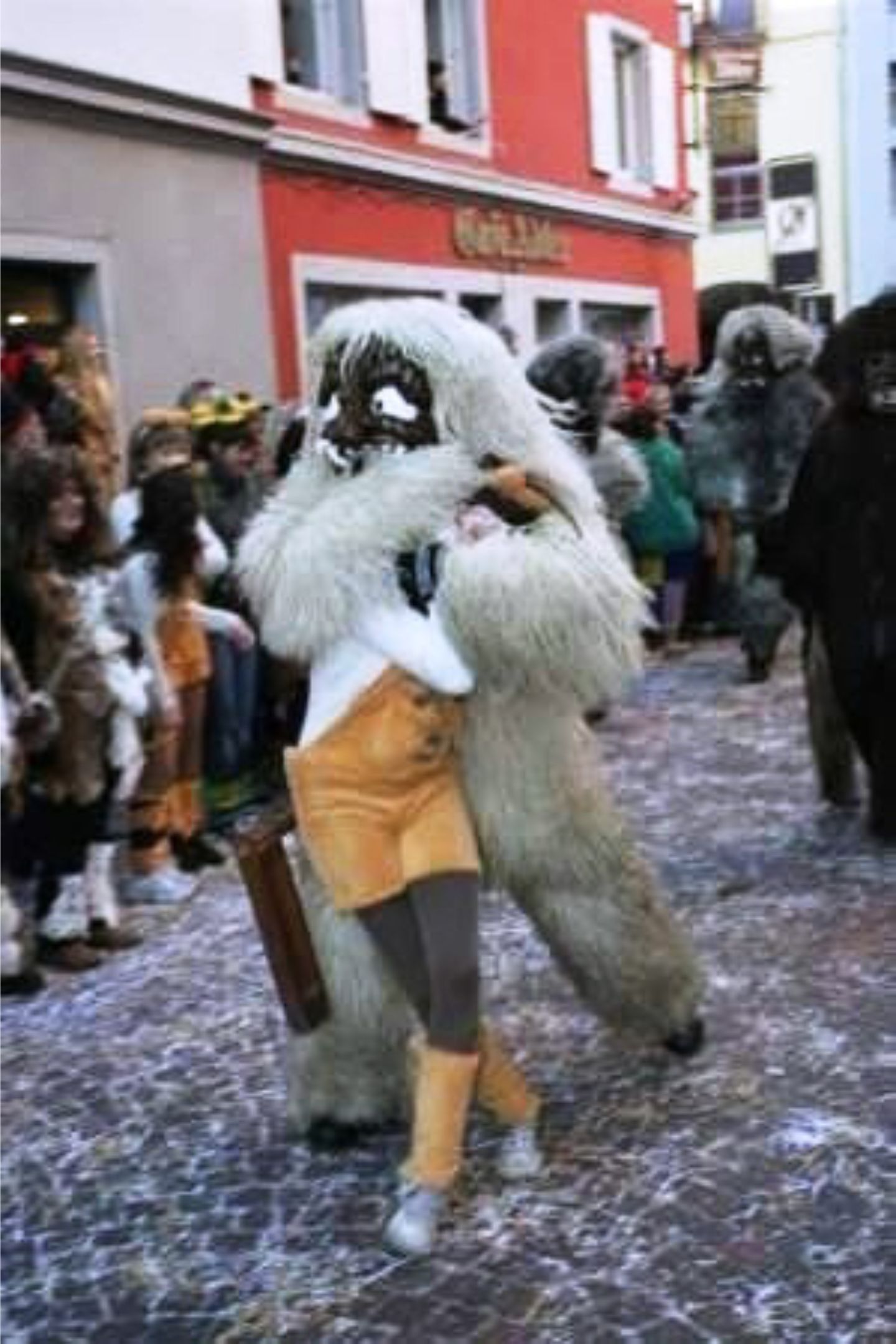 Umzug am Fasnachtssonntag: Schneeschreck gefolgt von der Maske des Schneeschreck-Autos.