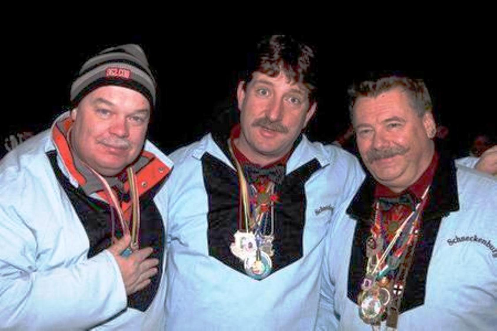 Die Elferräte Uwe Fiedler, Markus Deutinger und Heinz Auer beim Fasnachtsball der Schneckenburg im Konzil. Gut eingepackt hatte man Dienst an der Türe.