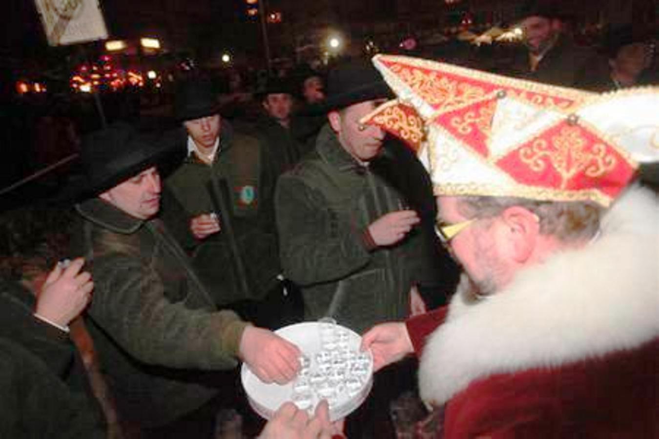 Narrenbaumstellen auf dem Gottmannplatz: Elferrat Hans-Peter Pfundstein verteilte den obligatorischen Schnaps.