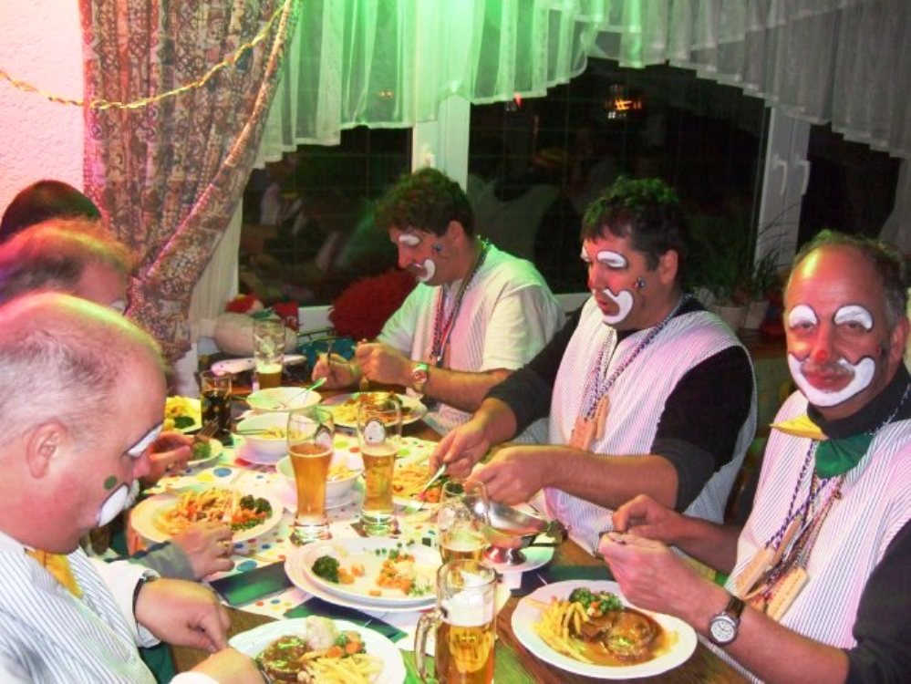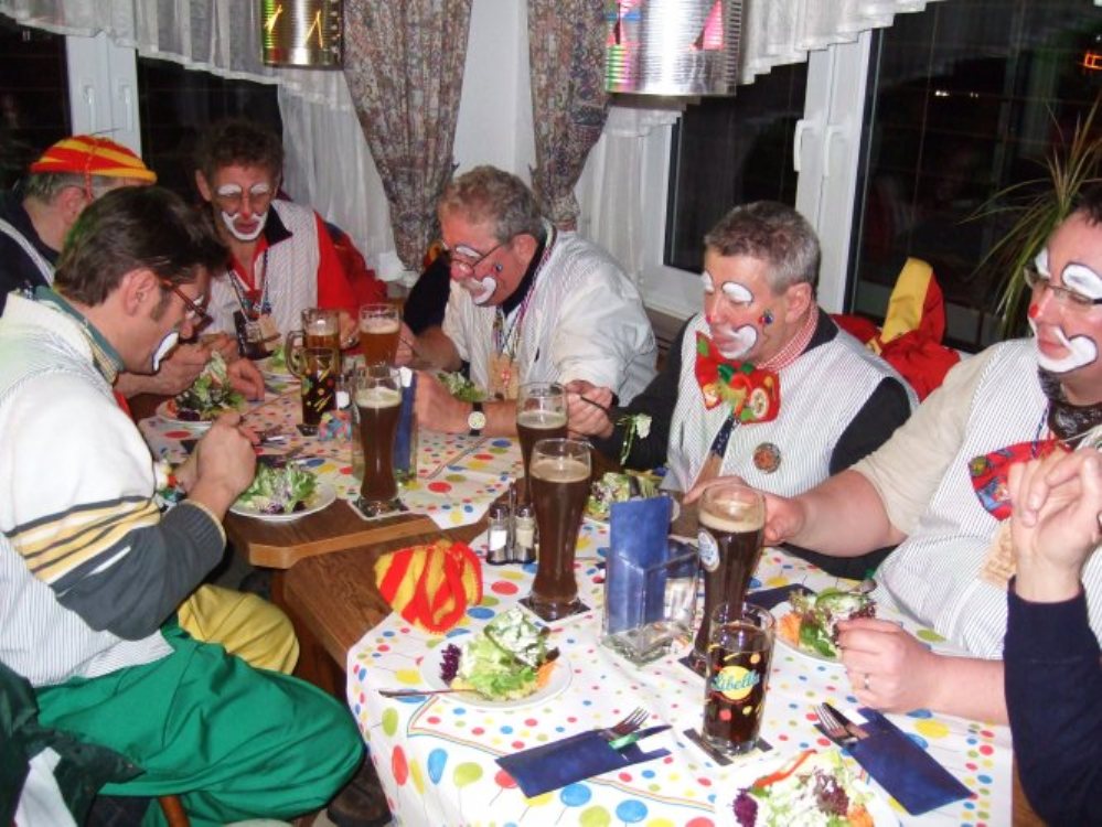 Rosenmontag mit der Clowngruppe: Essenspause in Überlingen am Ried.
