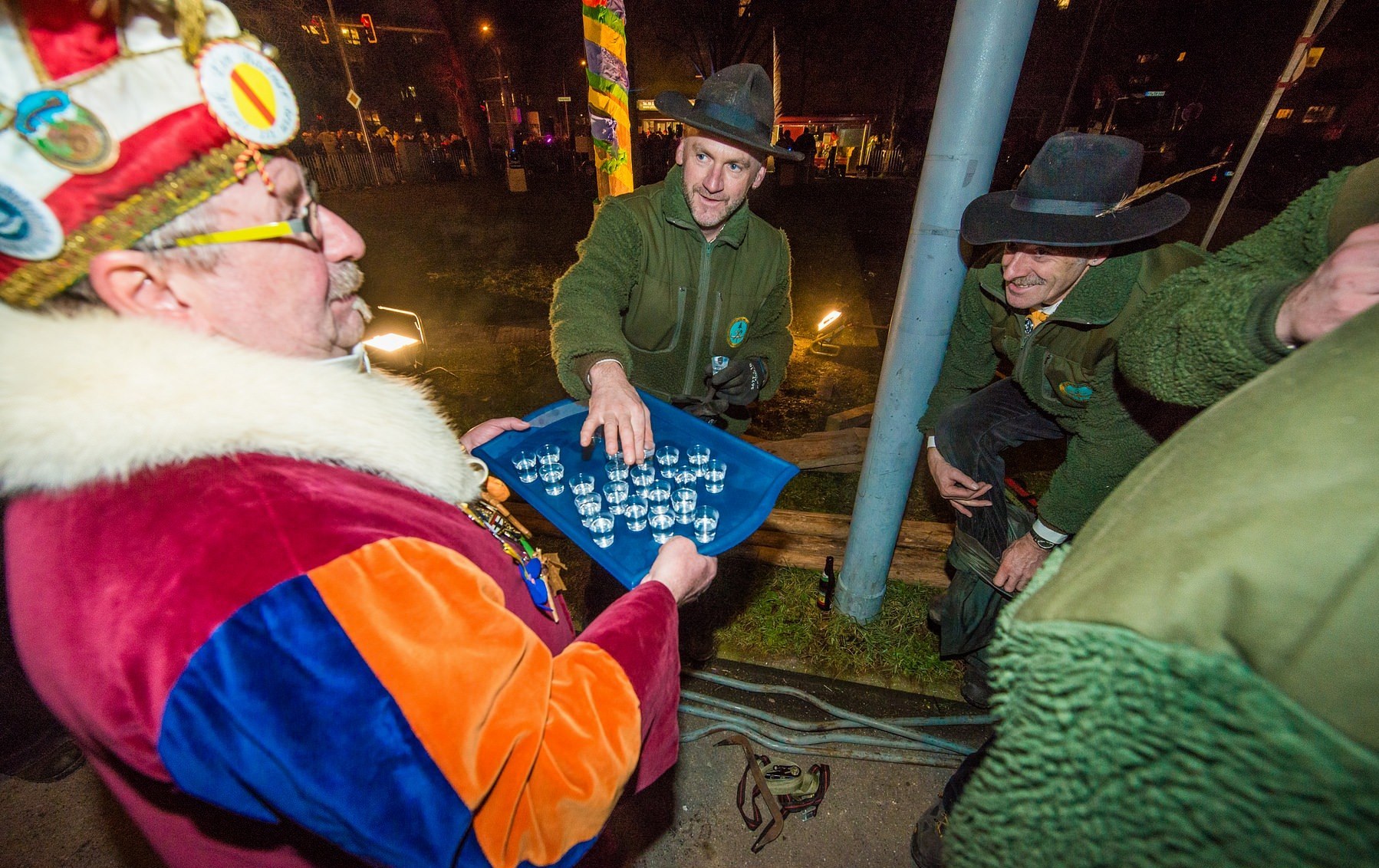 Narrenbaumstellen auf dem Gottmannplatz: Elferrat Hans-Peter Pfundstein verteilte den obligatorischen Schnaps.