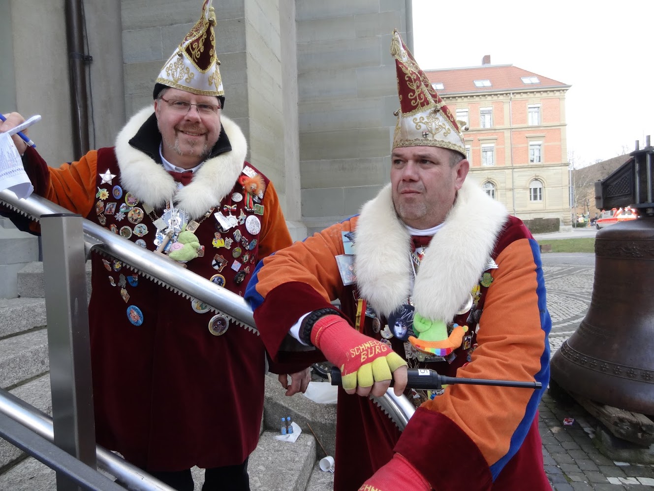Narrenbaumstellen auf dem Gottmannplatz: Elferrat Heinz Auer und Schneeschreck Harald Limbeck bestaunten die Höhe des Baumes.