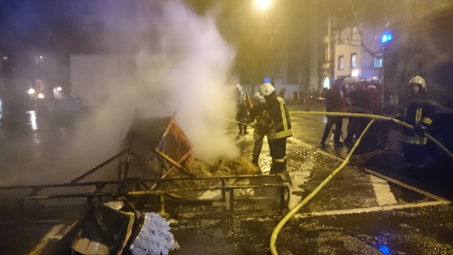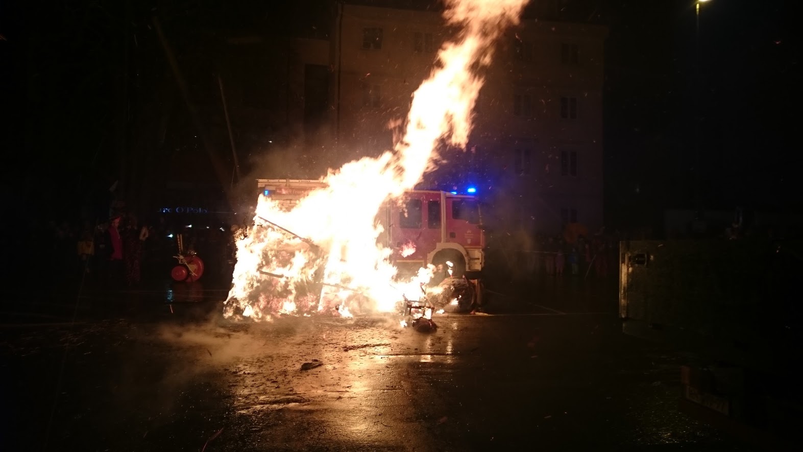 Verbrennung auf dem Stephansplatz: Da der Wind so heftig war, wurde die Puppe umgelegt.