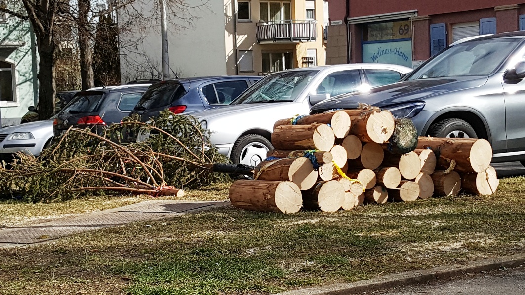 Rosenmontag: Wegen den starken Sturmböen musste der gekürtzte Narrenbaum am Morgen komplett gefällt werden.