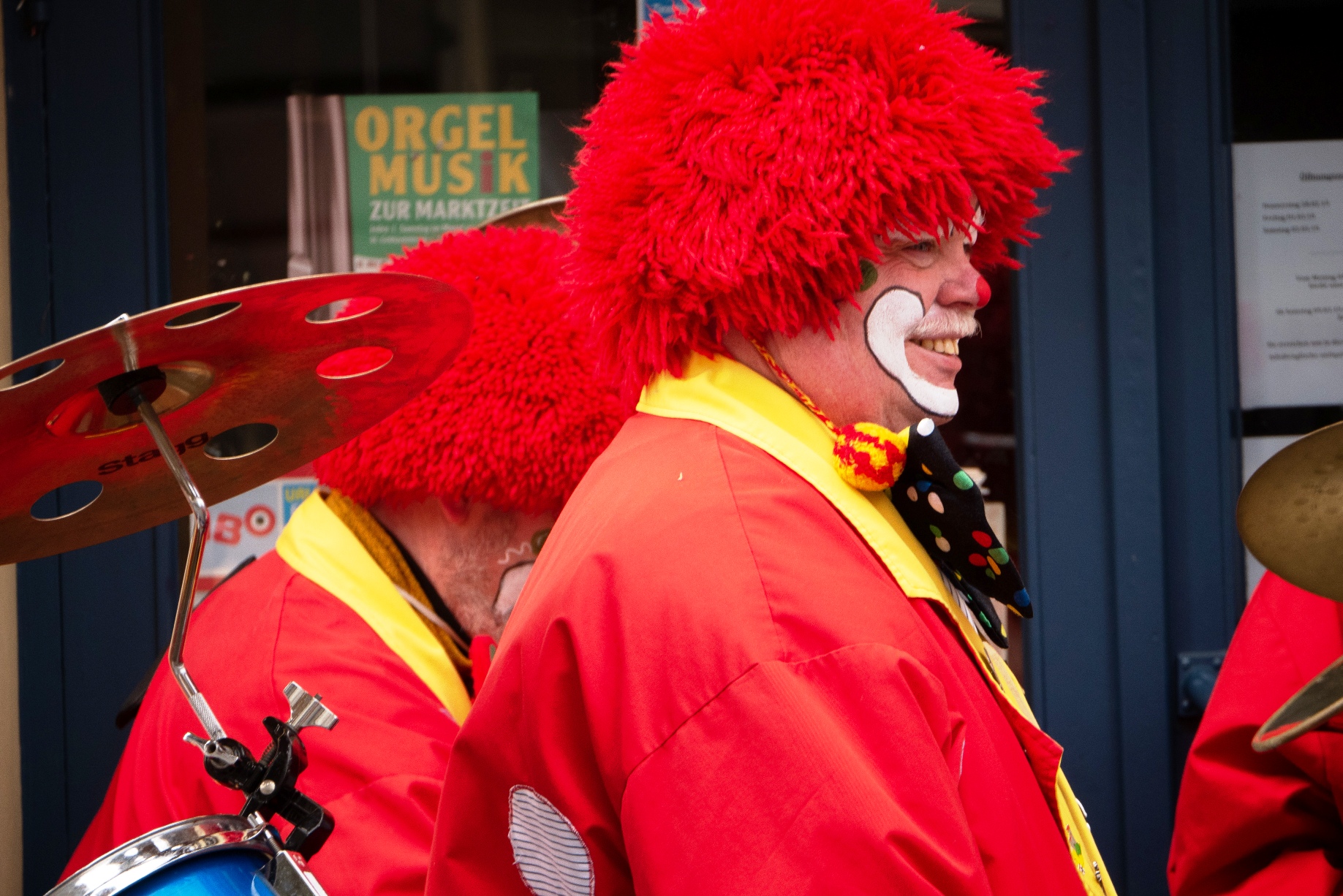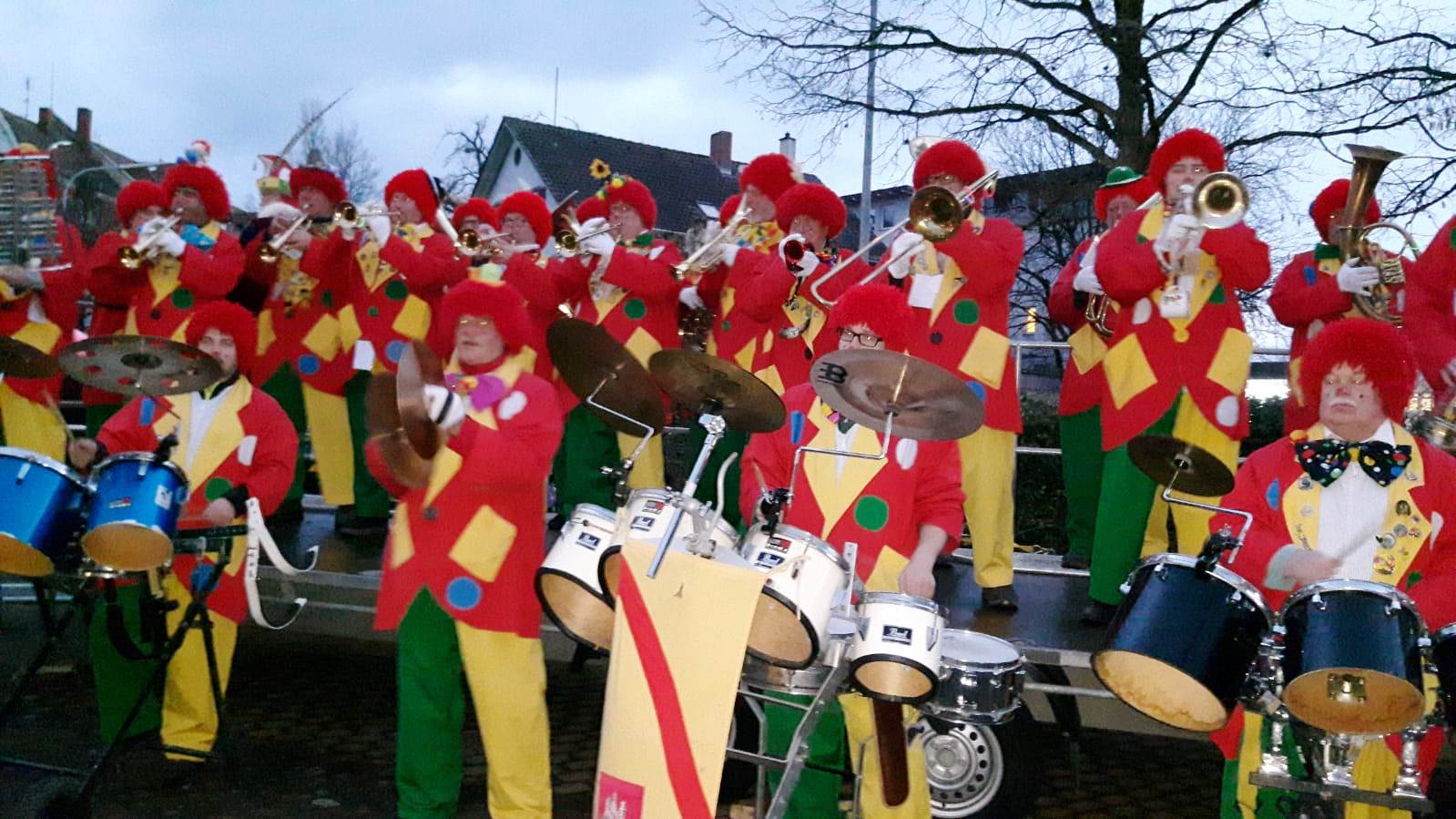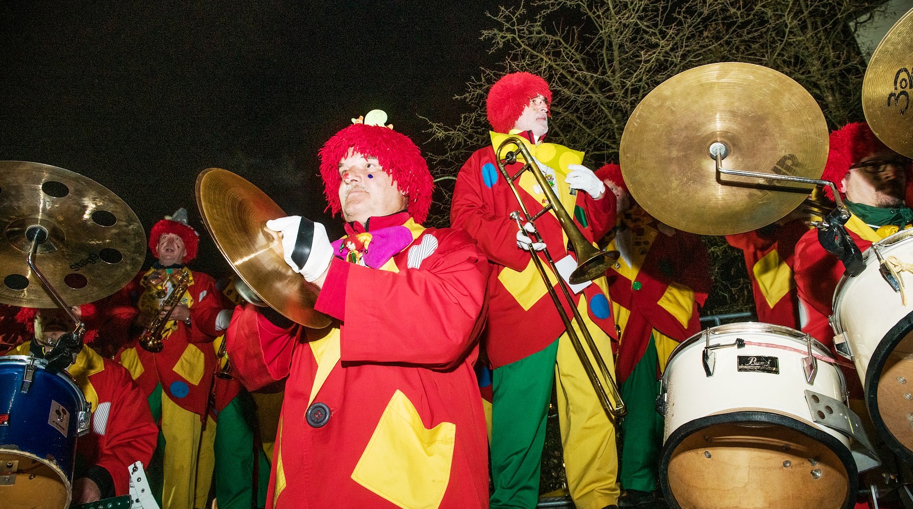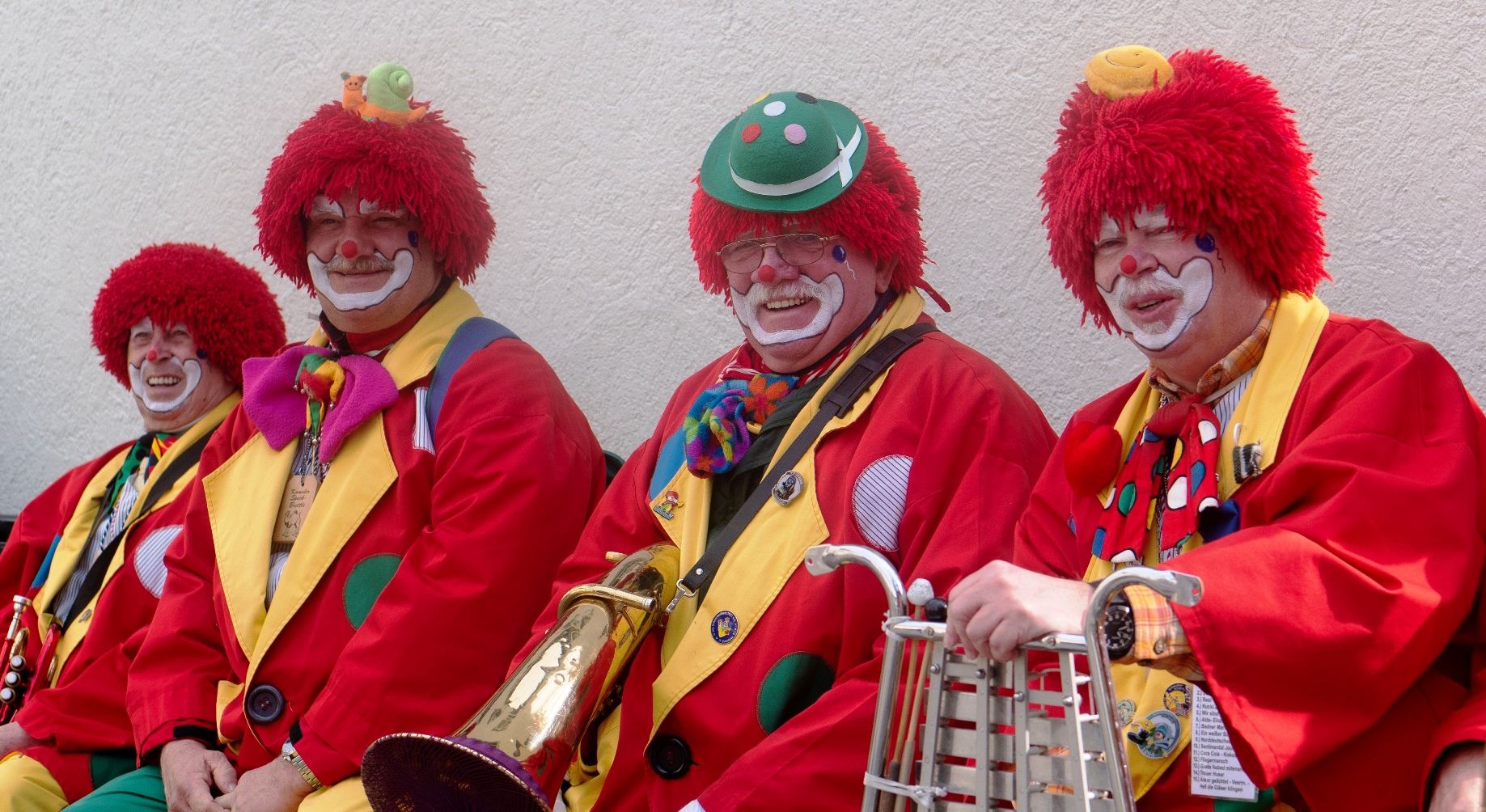 Rosenmontag: Die Clowngruppe auf der Gass'.