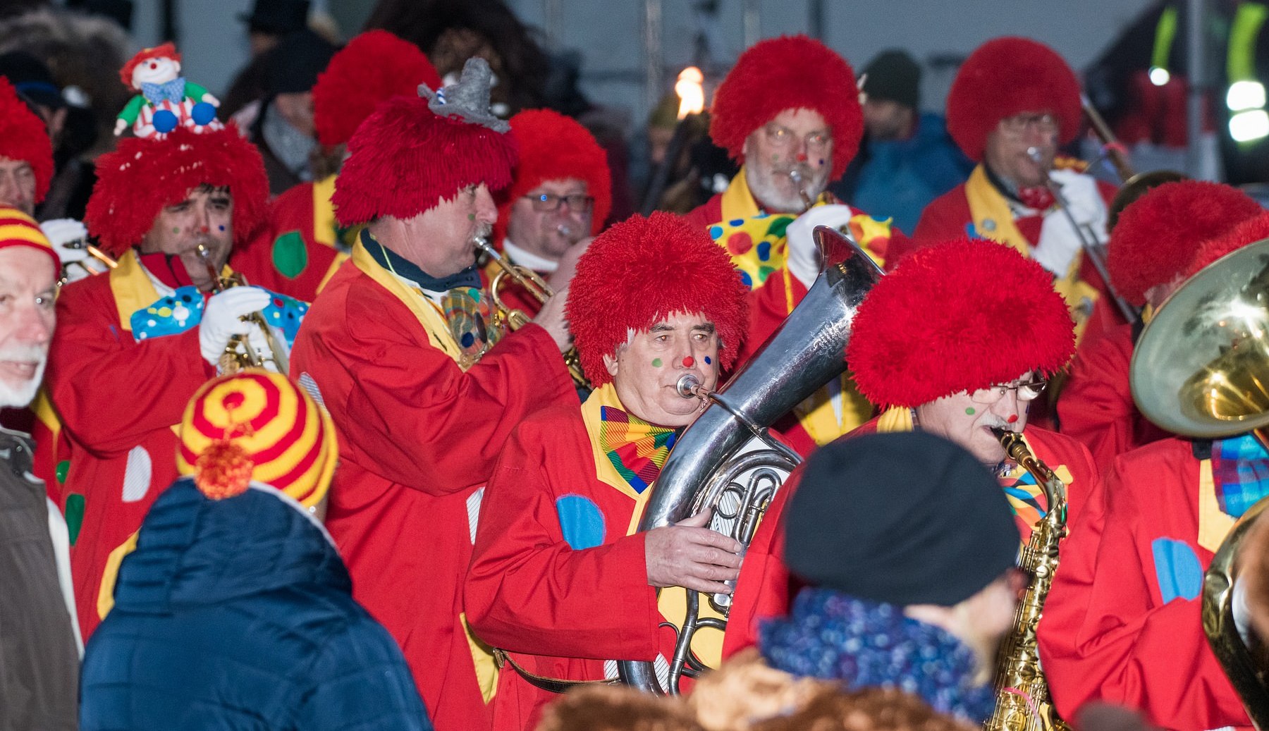 Narrenbaum Stellen auf dem Gottmannplatz: Die Clowngruppe spielte auf dem Platz.