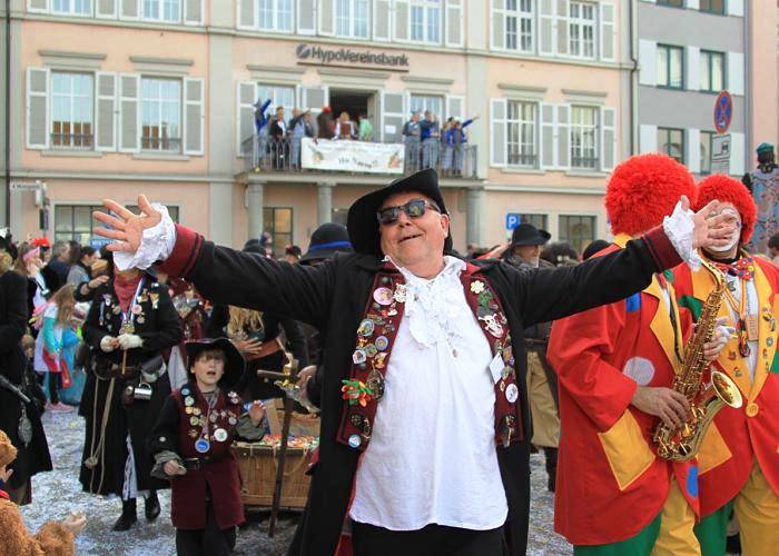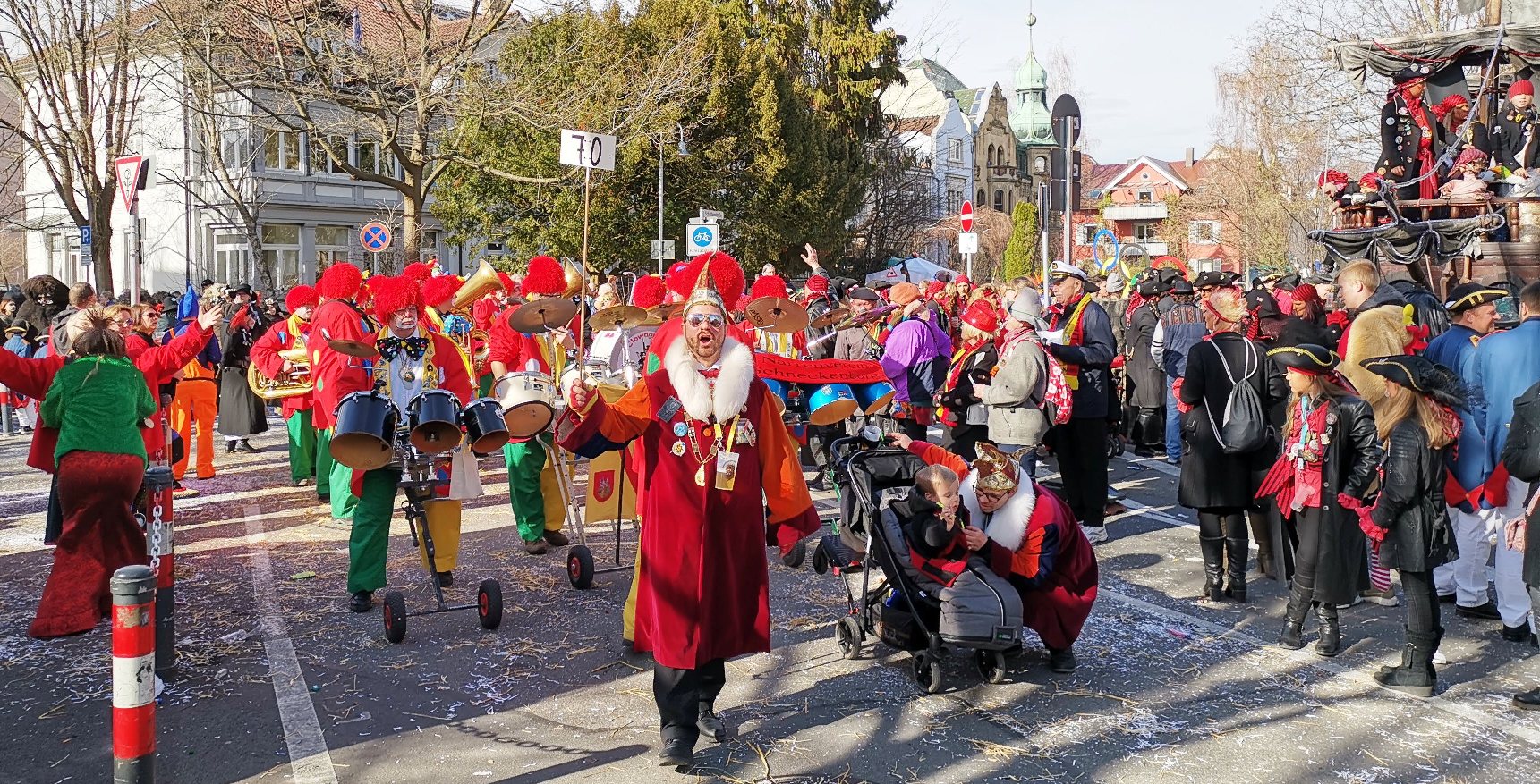 Umzug am Fasnachtssonntag: Arthur Bruderhofer führte die Schneckenburg an. Danach folgte die Clowngruppe.