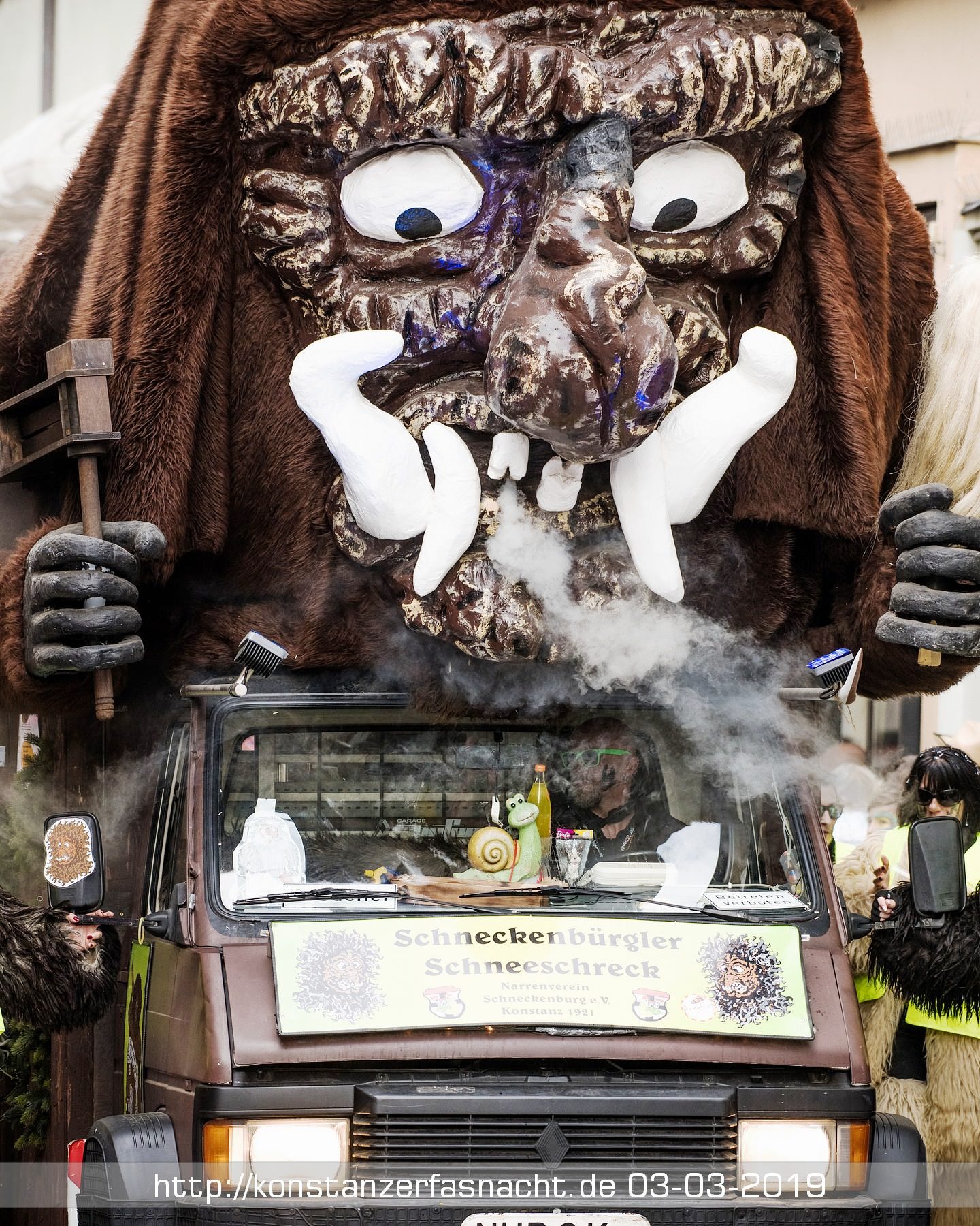 Umzug am Fasnachtssonntag: Das Schneeschreck-Auto beendete die Schneckenburg-Gruppe.