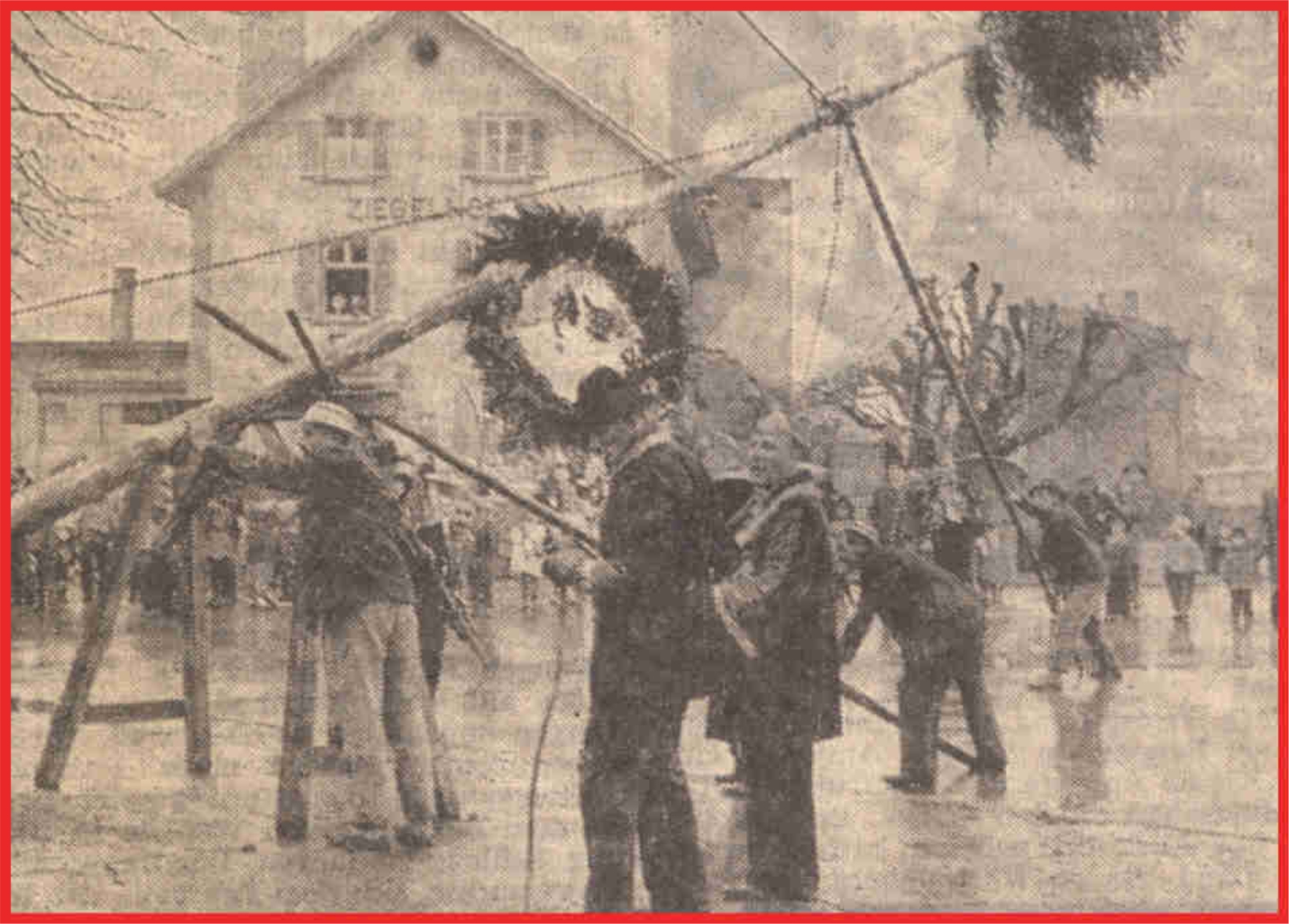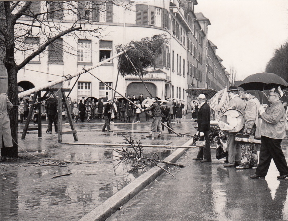 Schmutziger Donnerstag: Mühsamens Stellen des Narrenbaumes auf dem Gottmannplatz. Das Wetter war den Narren diesmal nicht so gesinnt.