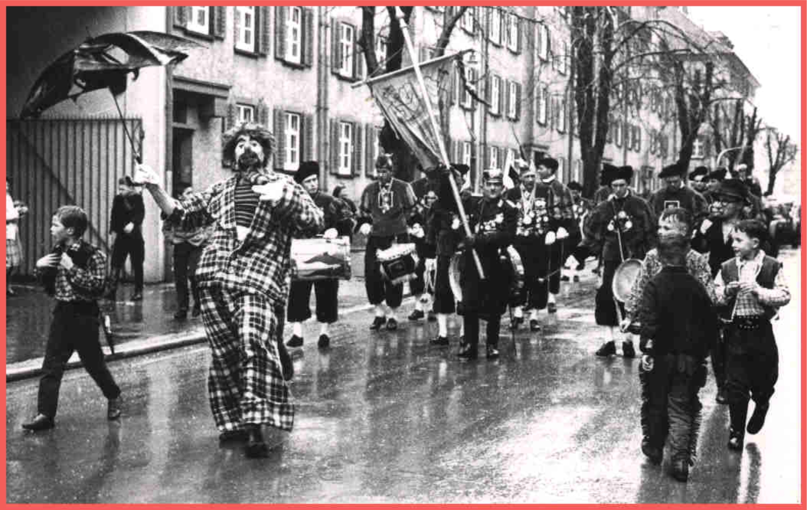 Schmutziger Donnerstag: Dauerregen beim Narrenbaumumzug. Vorneweg der Clown Martin Fistler.