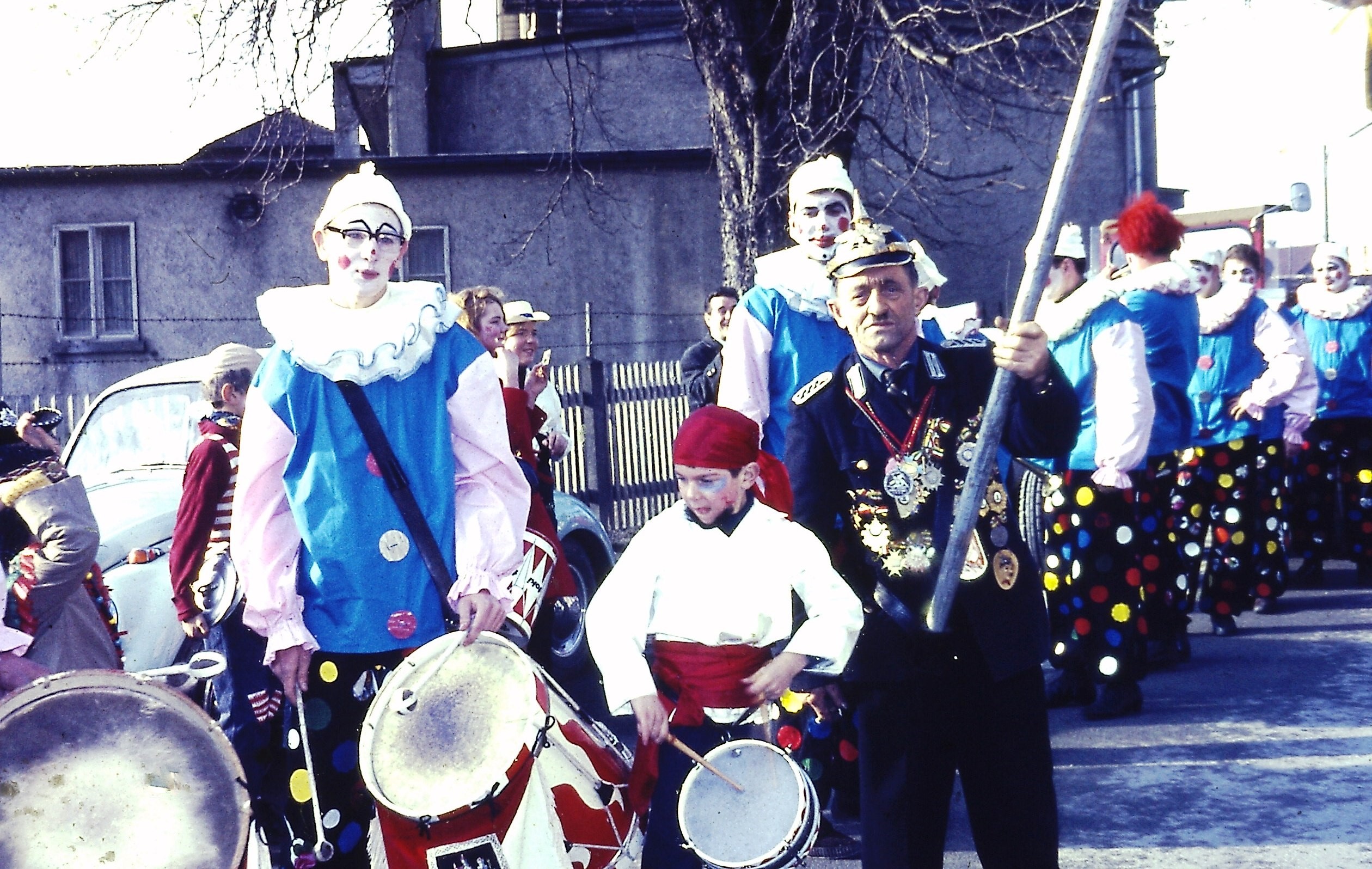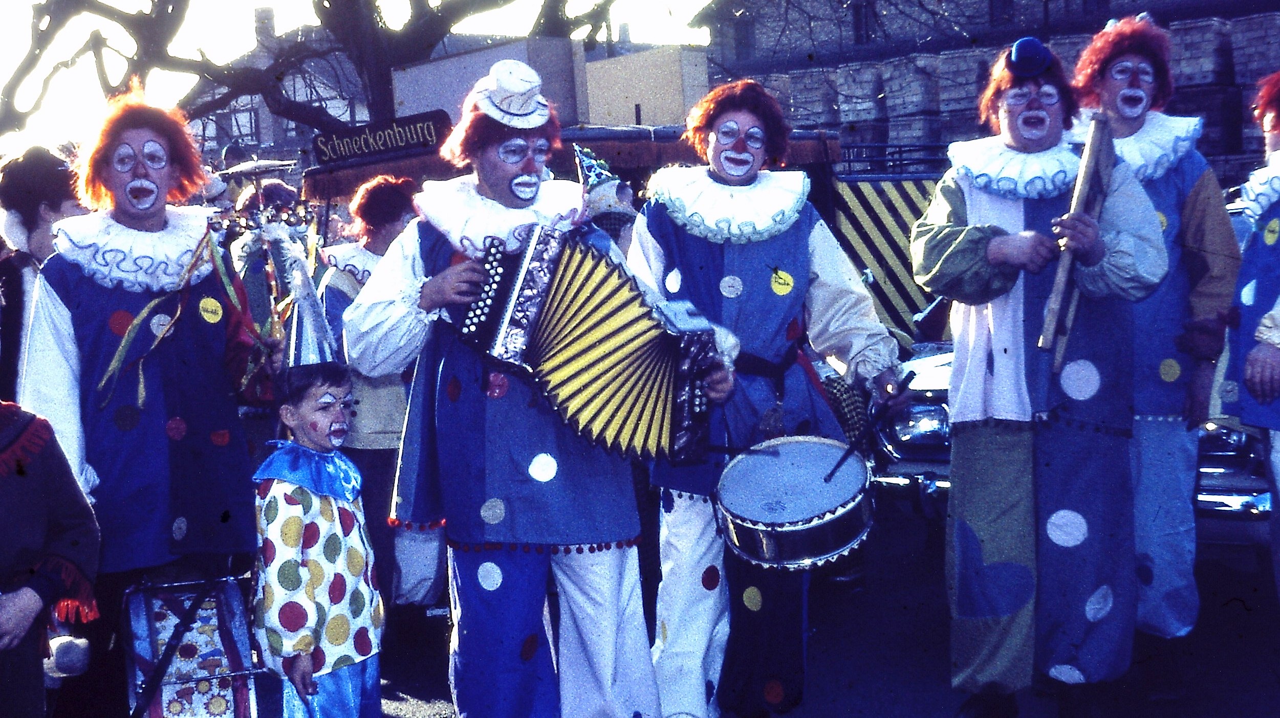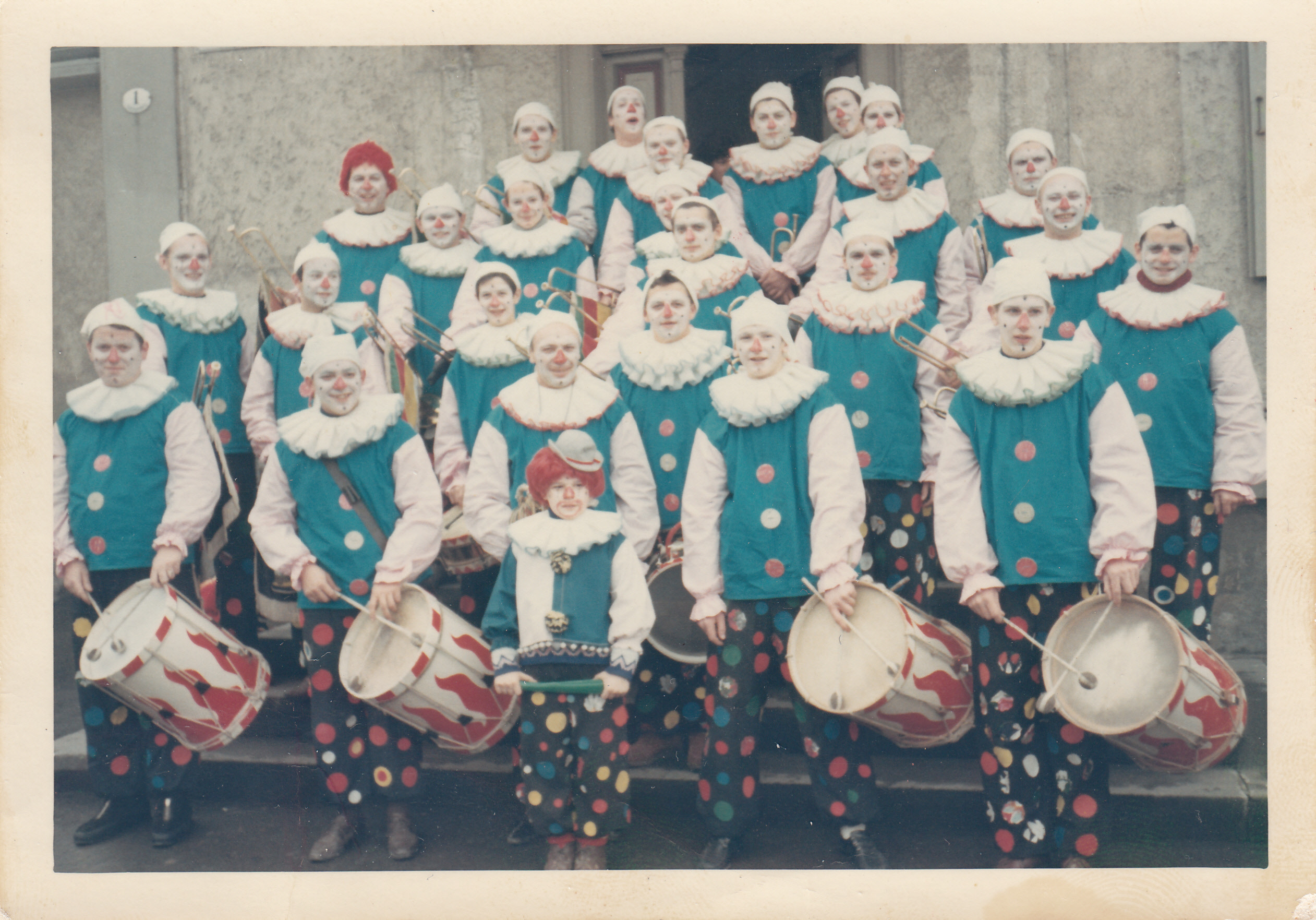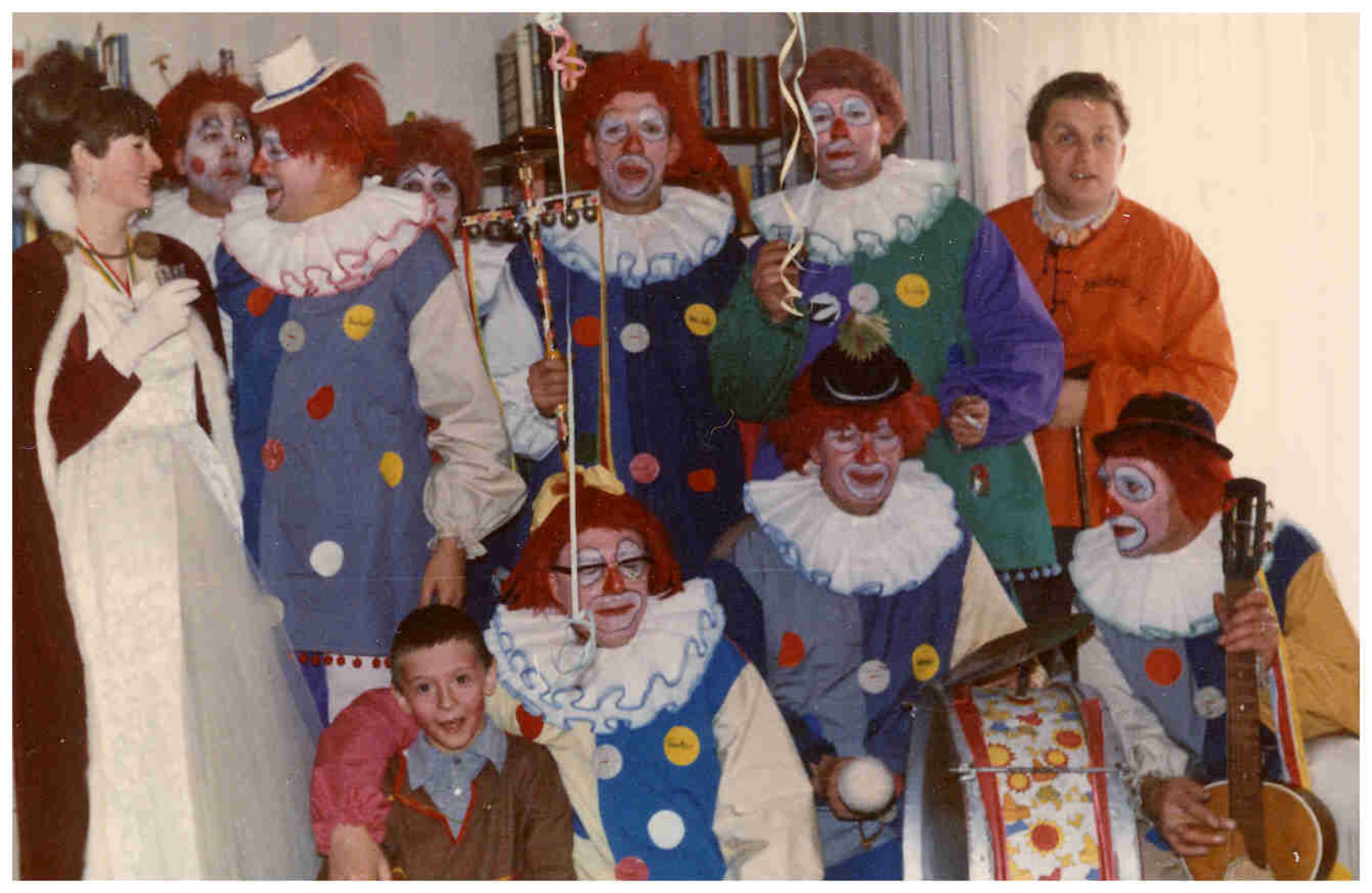 Schmutziger Donnerstag: Die Clowngruppe mit Prinzessin bei Kurt Matheis zu Hause.