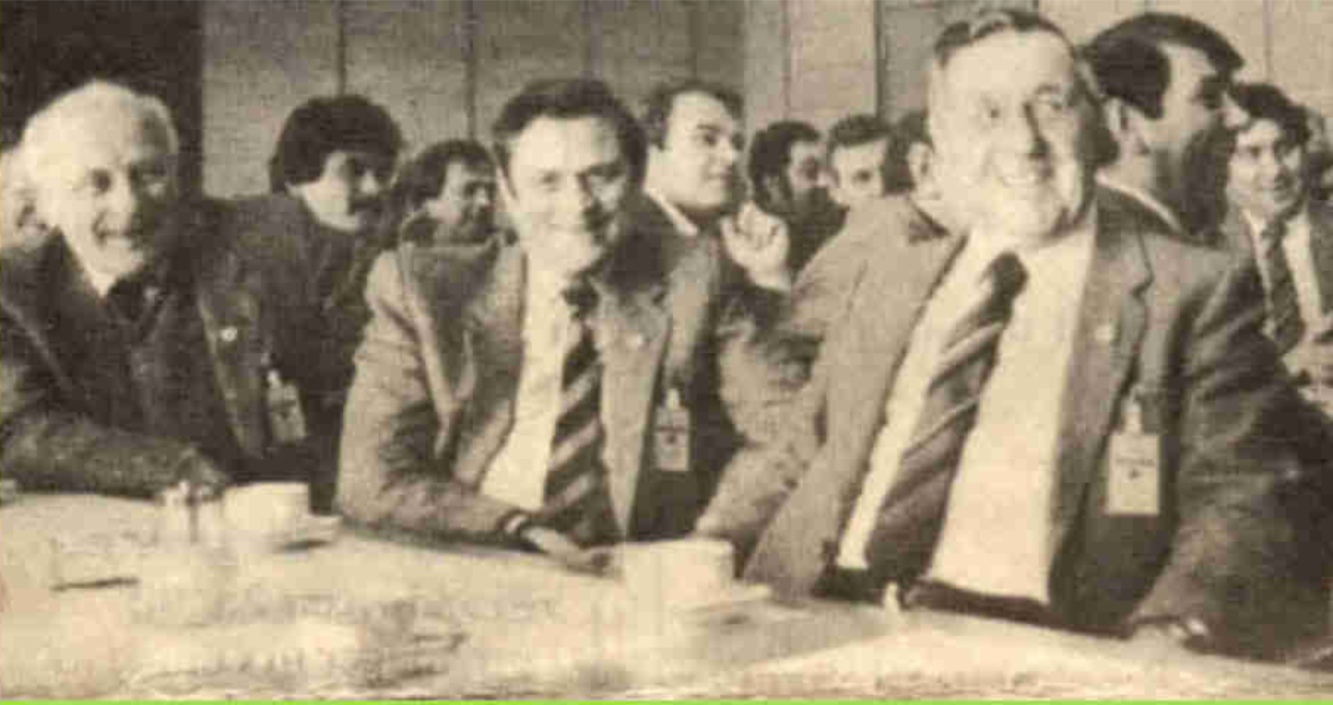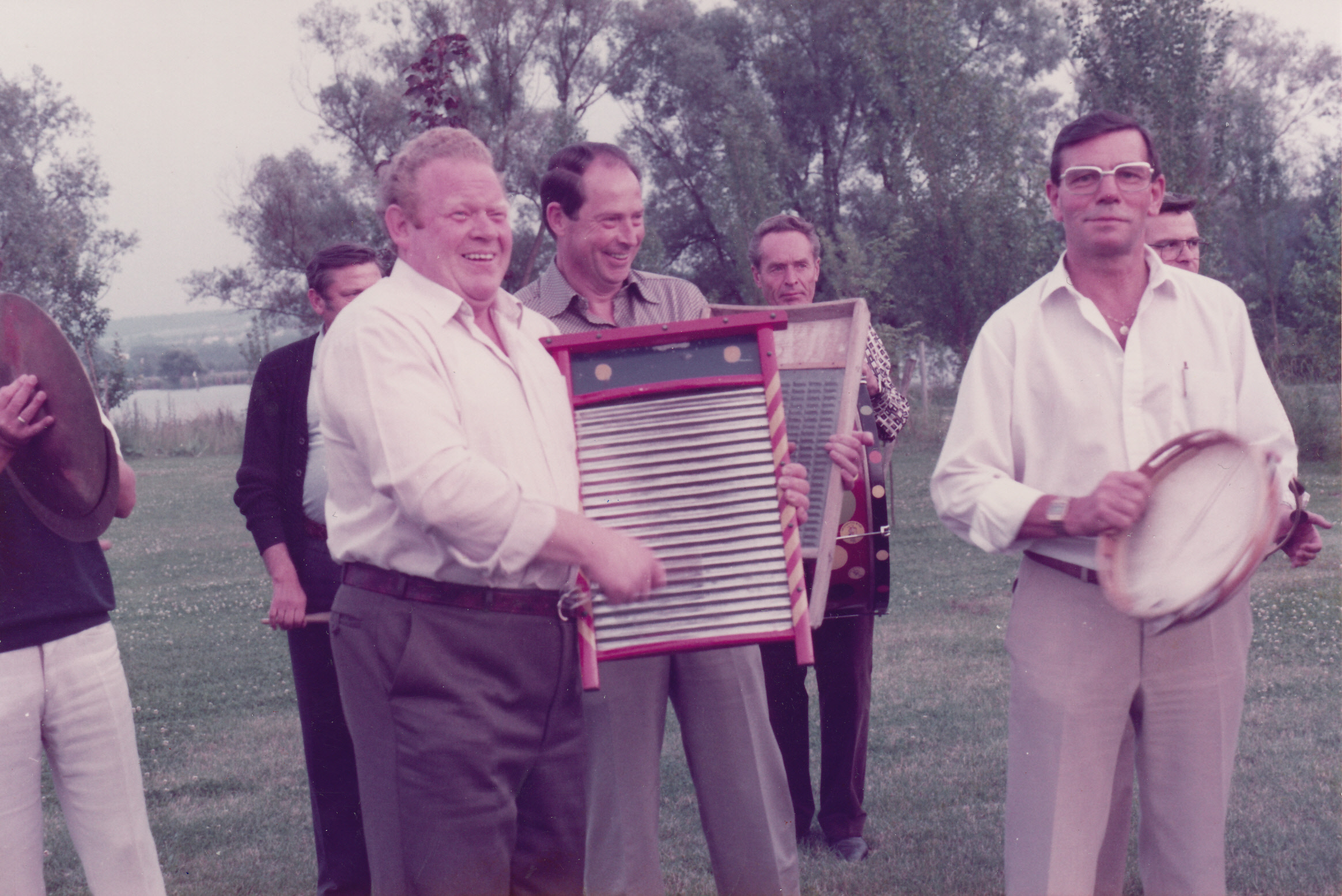 Auf Einladung des Bundestagsabgeordneten von Trotha durften die Konstanzer Narren den Bundestag in Bonn besuchen. V.l.n.r. Walter Buck, Paul Bischoff, Konti Uetz, dahinter Dieter Stöß.