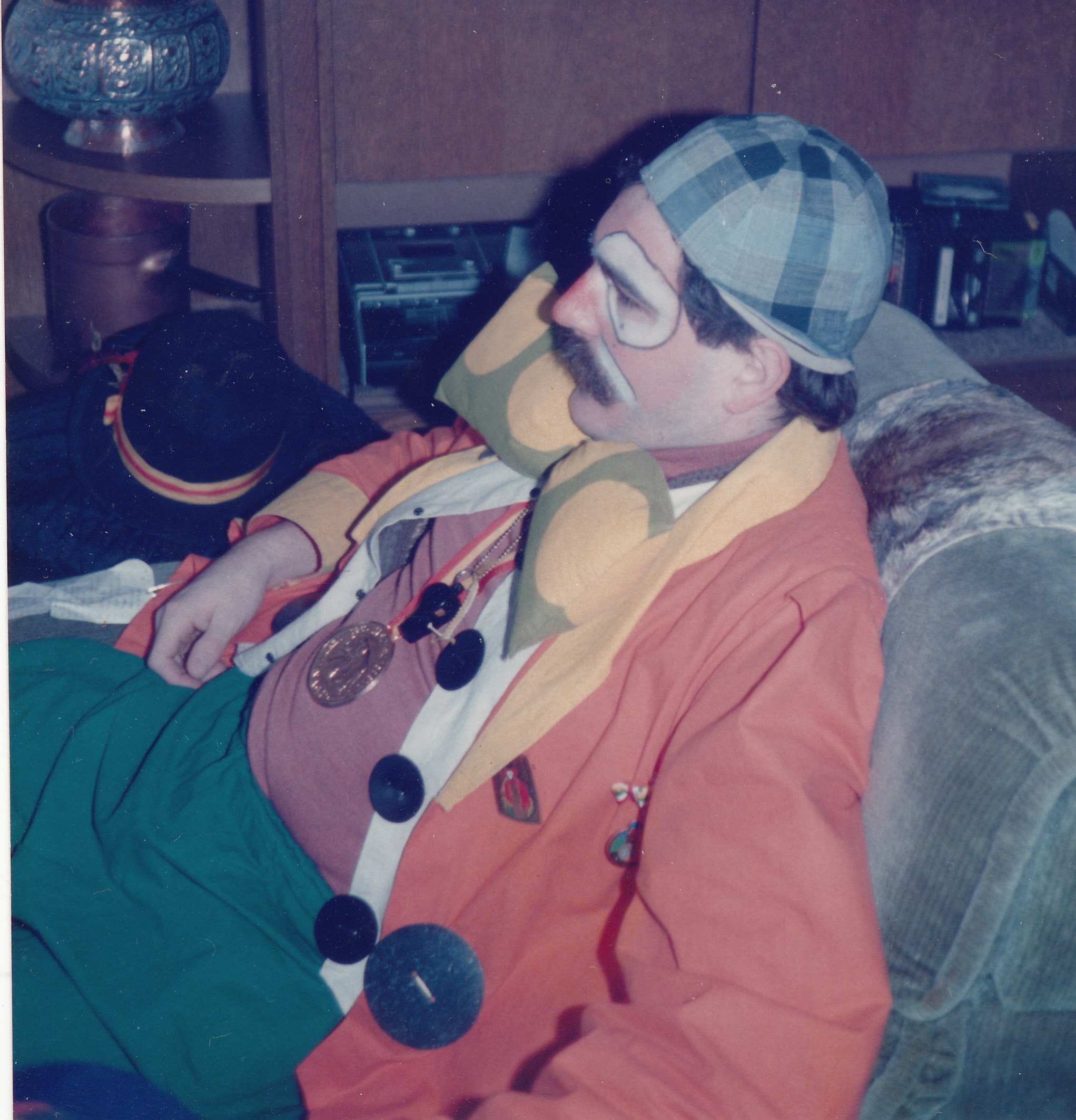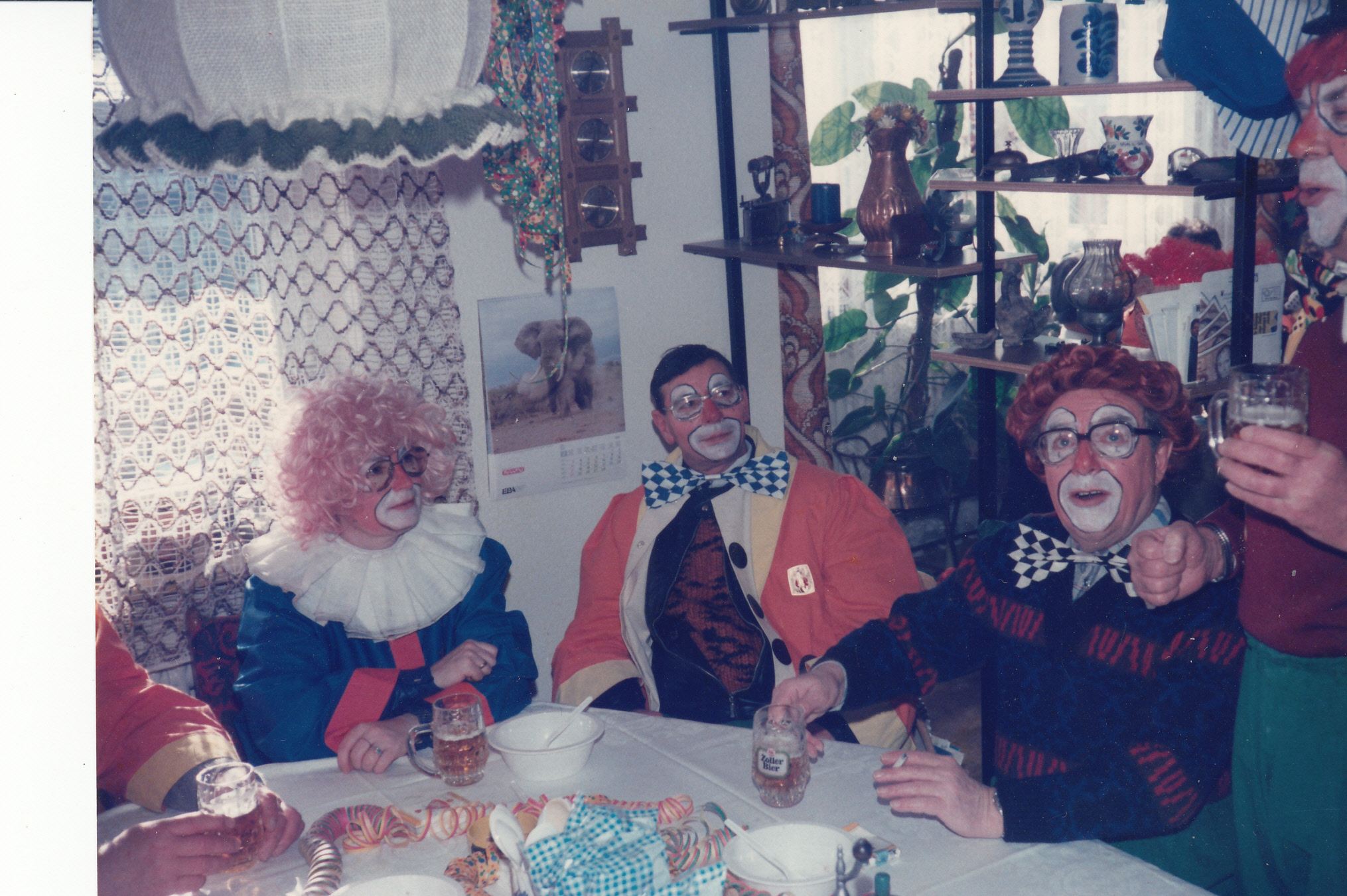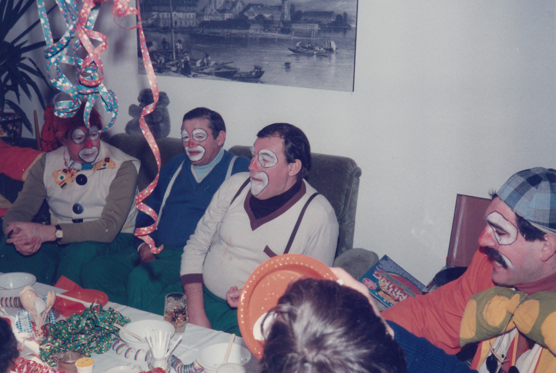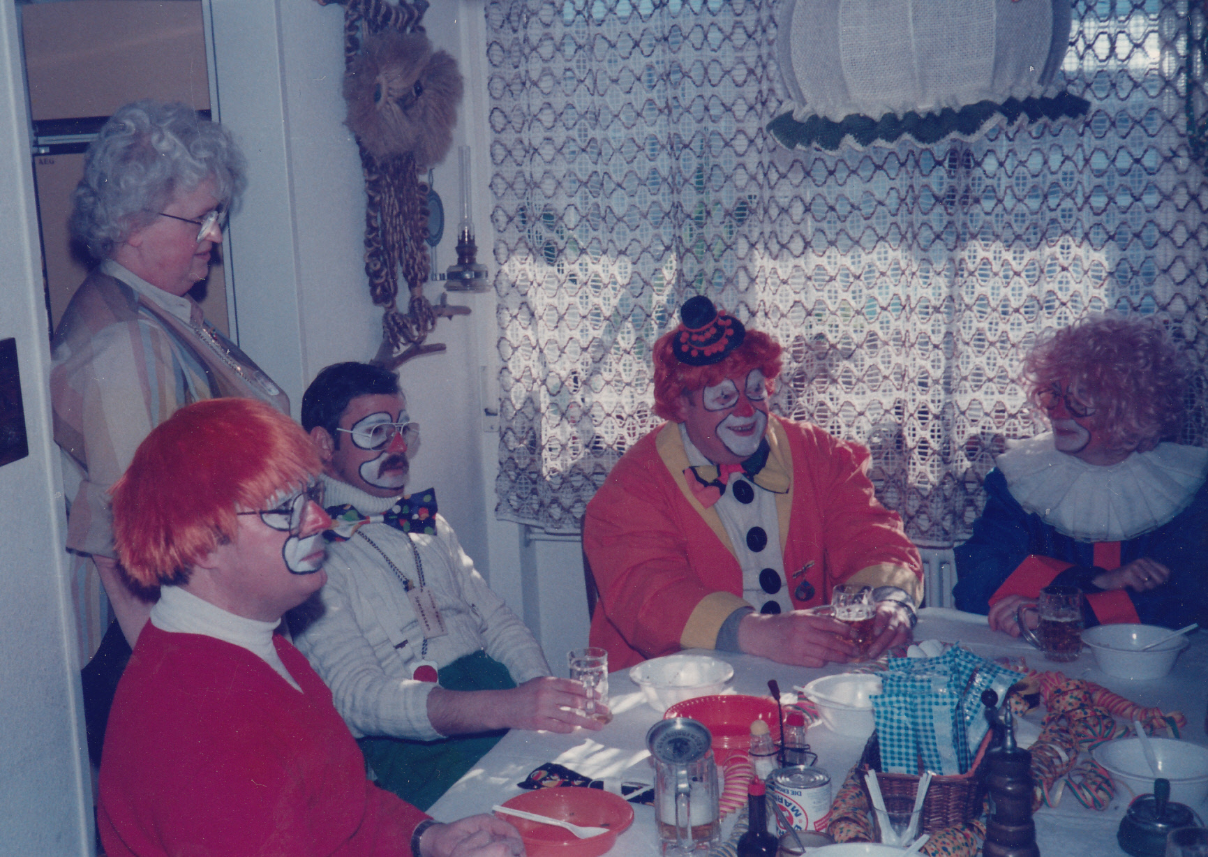 Rosenmontag: Clowngruppe im Wohnzimmer von Werner Mutter.